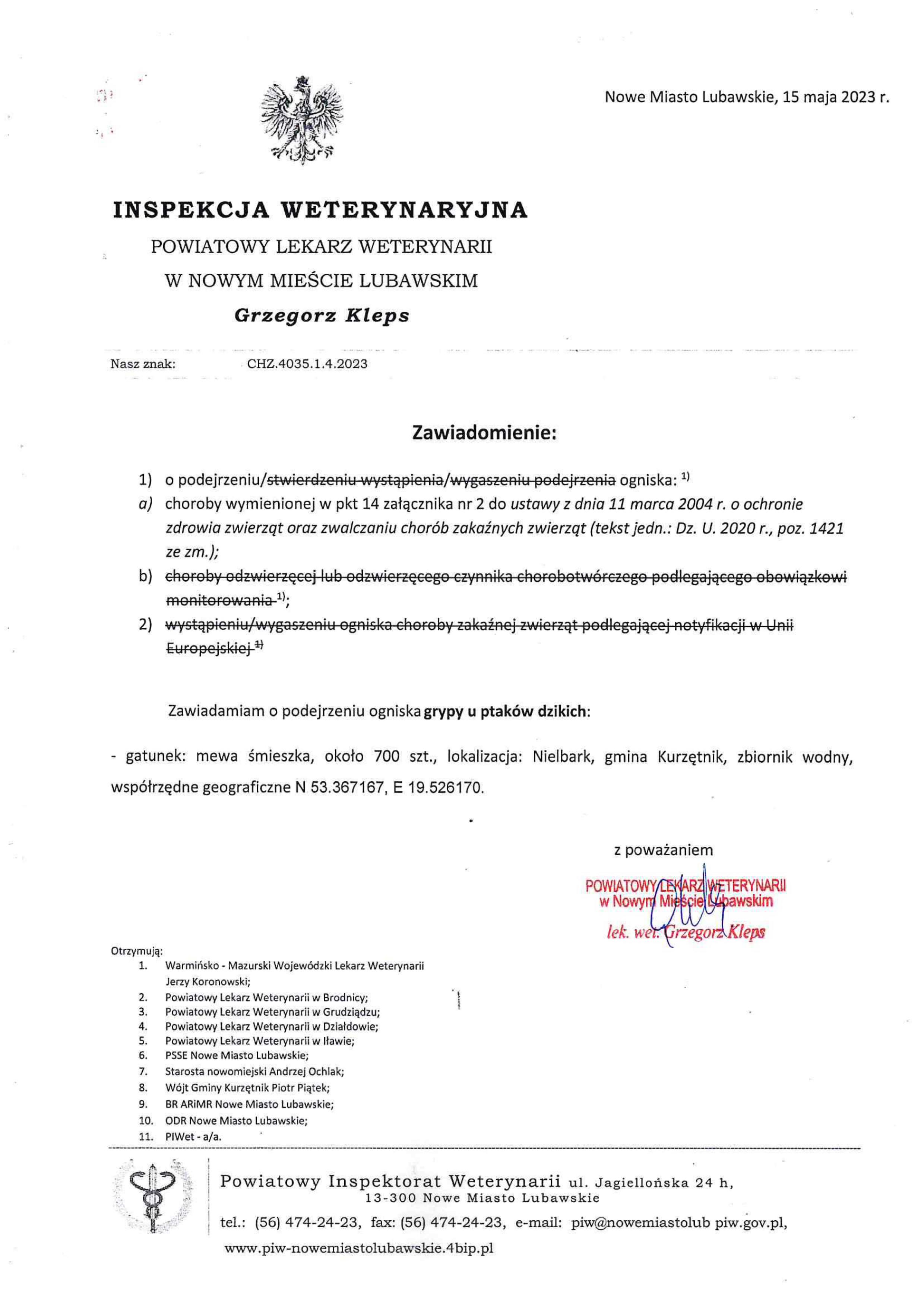 Zgodnie z Zawiadomieniem Powiatowego Lekarza Weterynarii w Nowym Mieście Lubawskim z dnia 15 maja 2023 r. informujemy o podejrzeniu ogniska grypy u ptaków dzikich: gatunek mewa śmieszka około 700 sztuk, lokalizacja: gmina Kurzętnik, zbiornik wodny ( wyrobisko) w miejscowości Nielbark. Zgodnie z zaleceniami PIW wyżej wymieniony akwen wodny zostaje wyłączony z użytkowania. Wszystkie przypadki zwiększonych upadków zarówno ptaków domowych, jak i dzikich w innych niż w/w lokalizacja należy niezwłocznie zgłaszać do Powiatowego Lekarza Weterynarii w Nowym Mieście Lubawskim lub do Powiatowego Centrum Zarządzania Kryzysowego przy Starostwie Powiatowym w Nowym Mieście Lubawskim, wójtów lub terenowych lekarzy weterynarii. W związku z potencjalnych zagrożeniem jakie może nieść wysoce zjadliwa grypa ptaków dla ludzi Powiatowy Lekarz Weterynarii w Nowym Mieście Lubawskim zaleca zachowanie szczególnej ostrożności.