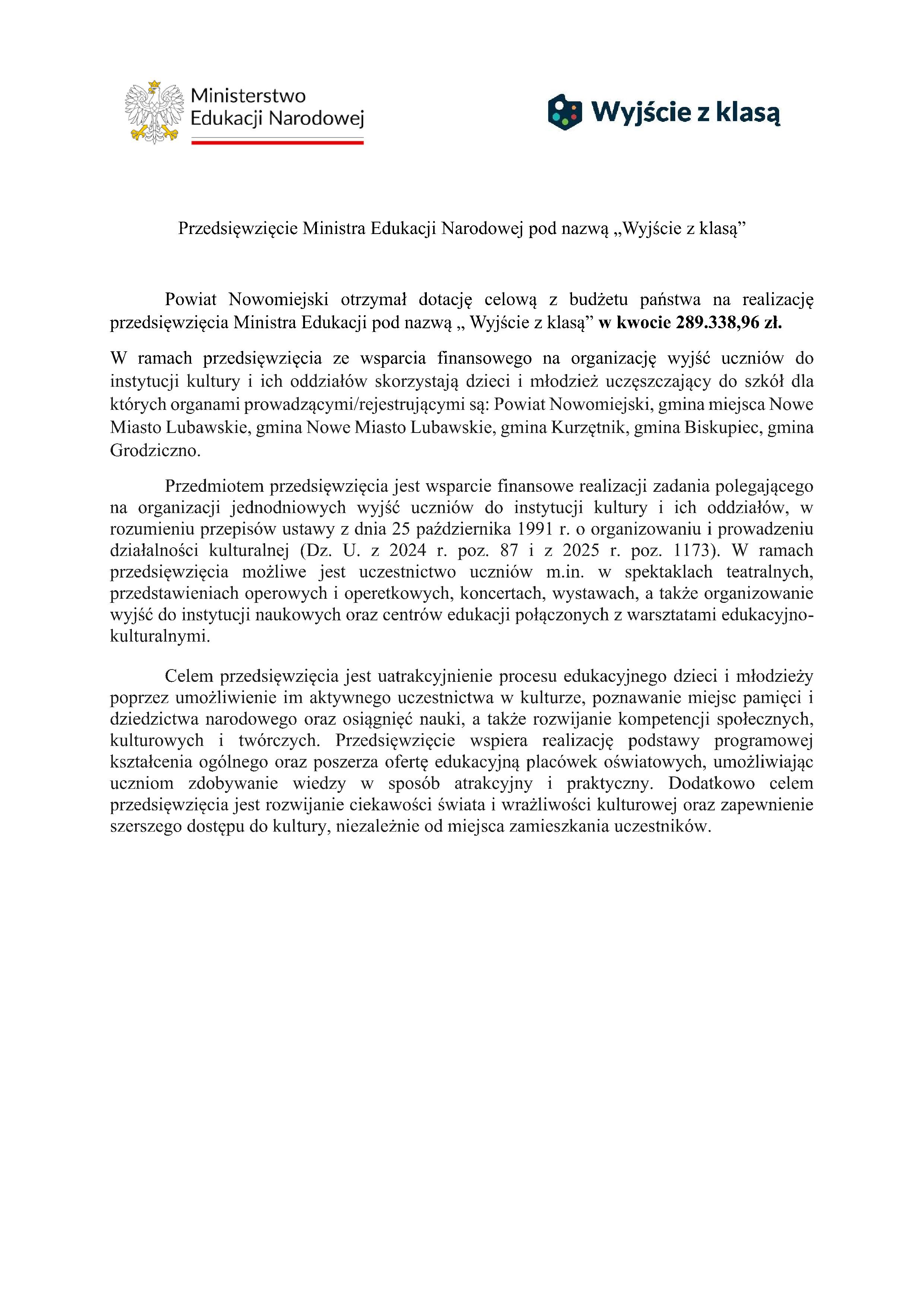 Przedsięwzięcie Ministra Edukacji Narodowej pod nazwą „Wyjście z klasą”