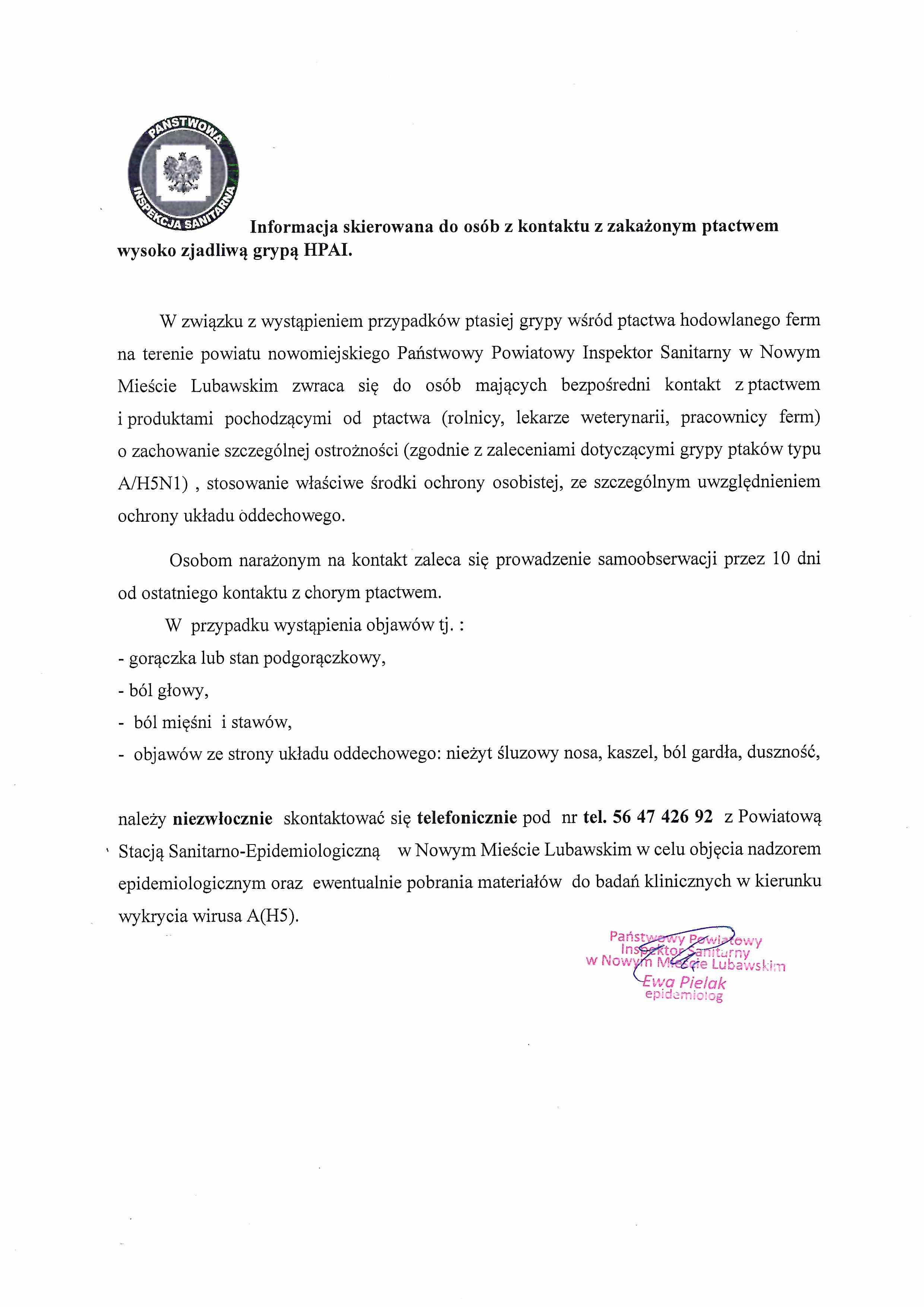 Komunikat PPIS w Nowym Mieście Lubawskim odnośnie wystąpienia przypadków ptasiej grypy
