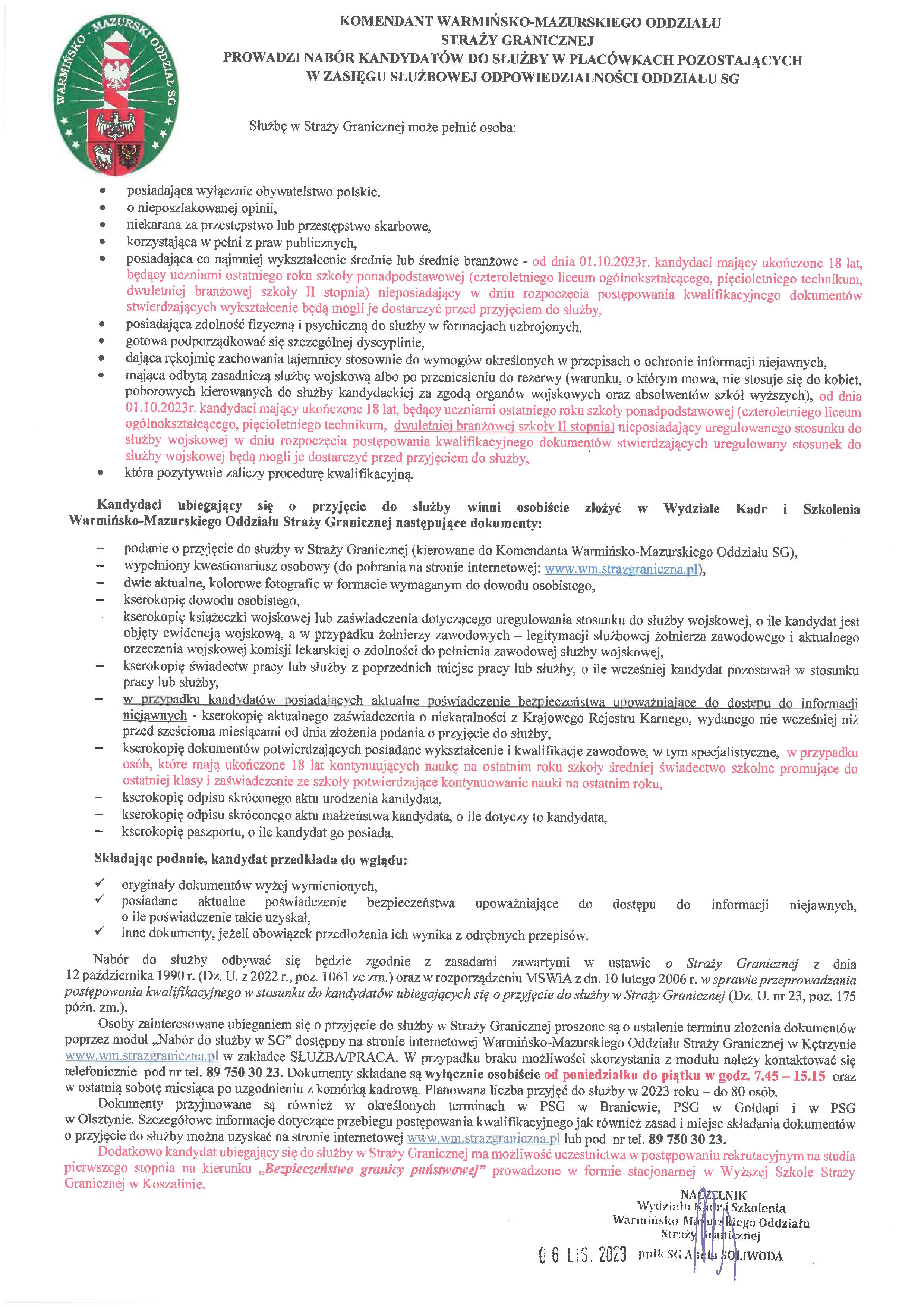 Komendant Warmińsko – Mazurskiego Oddziału Straży Granicznej prowadzi nabór kandydatów do służby