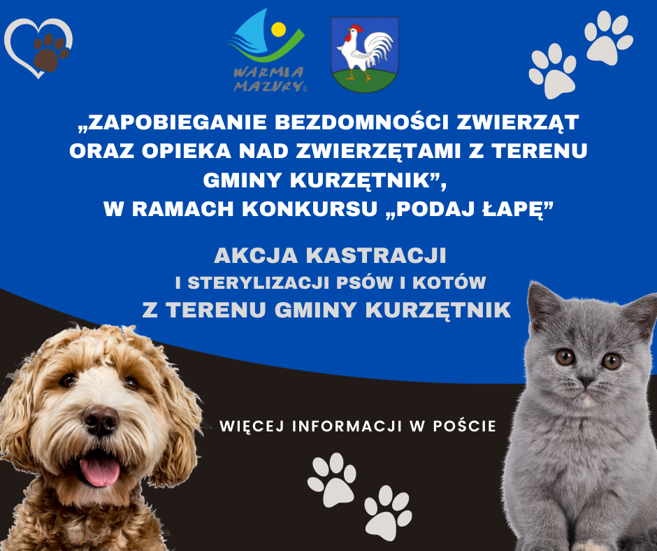 Gmina Kurzętnik pozyskała dofinansowanie z budżetu Województwa Warmińsko-Mazurskiego w Olsztynie na akcję kastracji i sterylizacji psów i kotów należących do właścicieli zamieszkujących teren gminy Kurzętnik, na zadanie realizowane pod nazwą „Zapobieganie bezdomności zwierząt oraz opieka nad zwierzętami z terenu gminy Kurzętnik”, w ramach konkursu „Podaj Łapę”.
