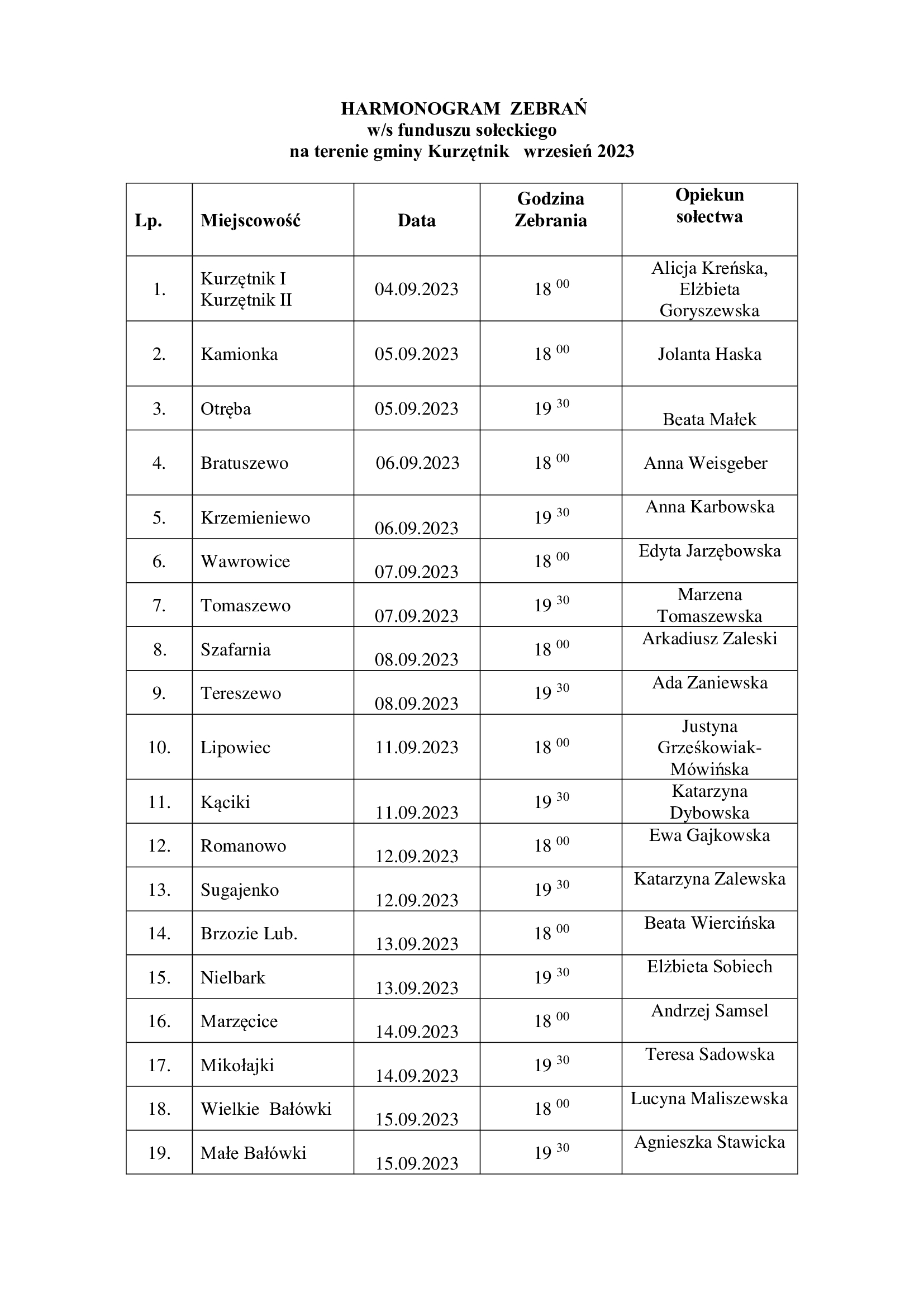 HARMONOGRAM ZEBRAŃ w/s funduszu sołeckiego na terenie gminy Kurzętnik wrzesień 2023 (aktualizacja)