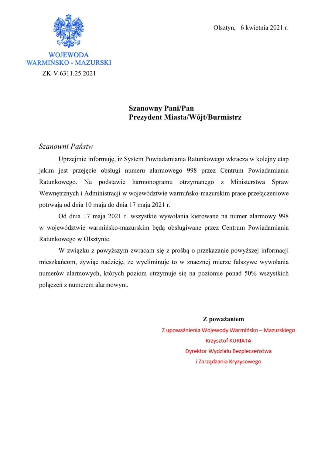 Uwaga! Zmiany w Systemie Powiadamiania Ratunkowego! Od 17 maja 2021 r. wszystkie wywołania kierowane na numer alarmowy 998 w województwie warmińsko - mazurskim będą obsługiwane przez Centrum Powiadamiania Ratunkowego w Olsztynie. Przedmiotowa zmiana ma przyczynić się do wyeliminowania fałszywych wywołań numerów alarmowych.