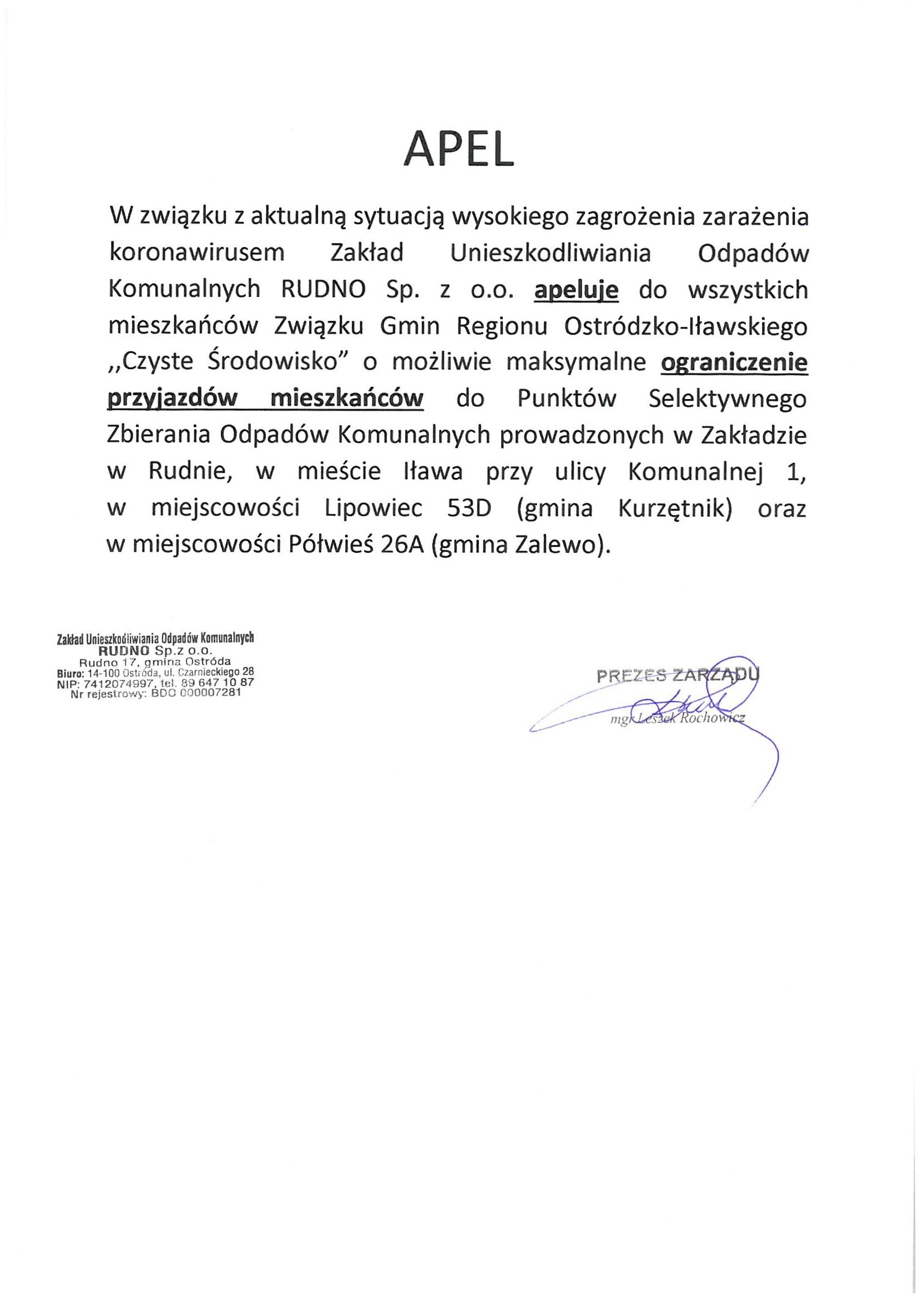 Informuję, że ZUOK RUDNO Sp. z o.o. do odwołania ogranicza godziny przyjęcia odpadów w Punktach Selektywnej Zbiórki Odpadów Komunalnych w miejscowościach Rudno, Lipowiec, Półwieś, miasto Iława.