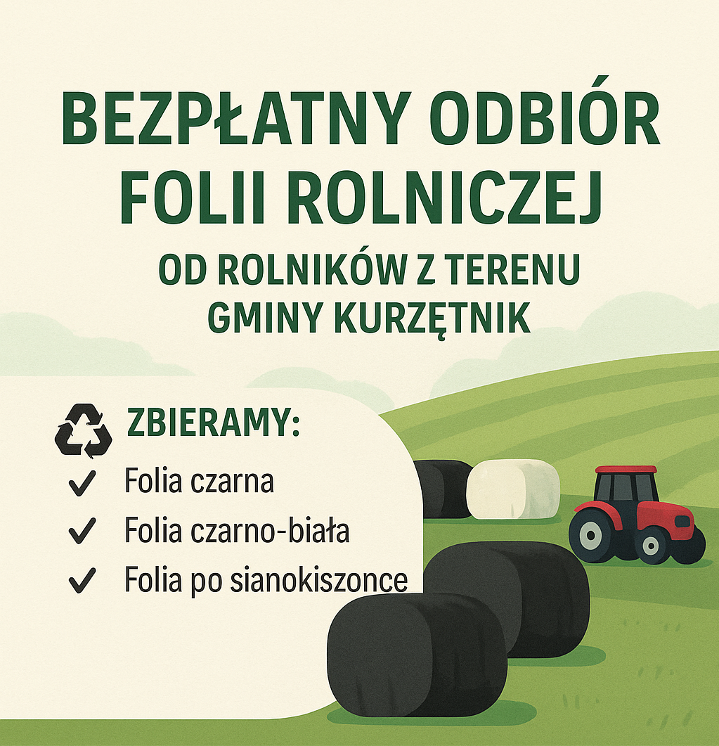 Osoby zainteresowane bezpłatnym odbiorem folii rolniczych pochodzących z własnej działalności rolniczej mogą przekazywać do dnia 10.06.2025 r. do Urzędu Gminy u Kurzętniku wypełnione ankiety o ilości posiadanej folii (czarnej, czarno-białej, po sianokiszonce). Ankieta dostępna jest w linku, u sołtysów, a także w Urzędzie Gminy w pokoju nr 4.