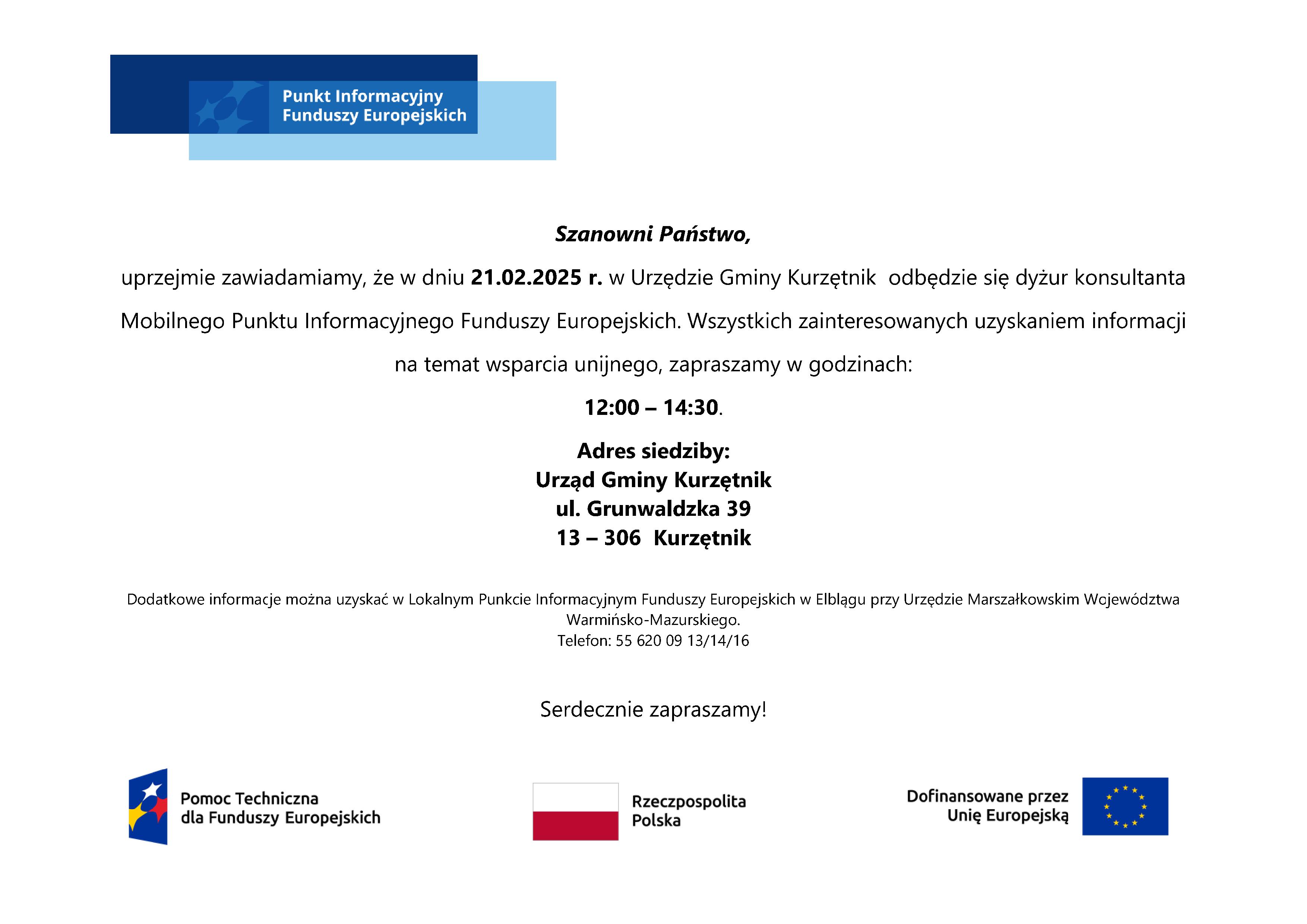 Mobilny Punkt Informacyjny Funduszy Europejskich w Urzędzie Gminy Kurzętnik w dniu 21.02.2025 r. (piątek) w godz. 12:00-14:30.