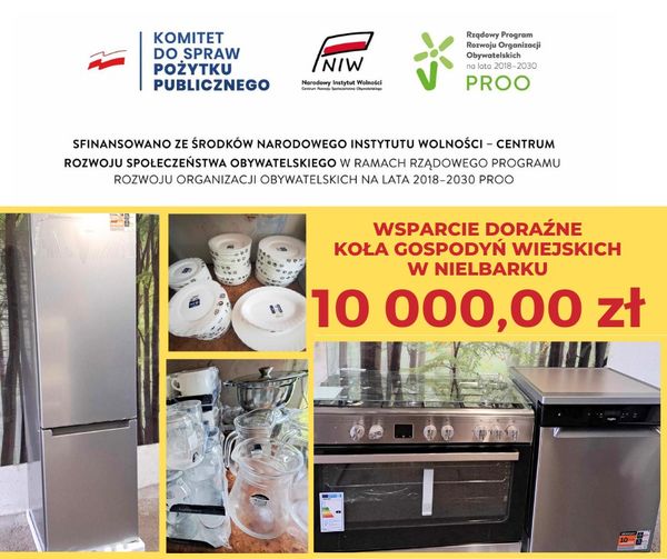 Wsparcie doraźne Koła Gospodyń Wiejskich w Nielbarku. W ramach realizacji zadania zostało zakupione podstawowy sprzęt AGD (lodówka, kuchnia gazowo-elektryczna, zmywarka) oraz zastawa stołowa. Zostały pokryte wydatki wynikające z nagłej potrzeby Koła Gospodyń Wiejskich w Nielbarku powstałej w wyniku wystąpienia losowej sytuacji - zdarzenia nagłego i niemożliwego do przewidzenia jakim był pożar świetlicy wiejskiej w Nielbarku. Miała ona istotny wpływ na skuteczność działania organizacji i realizacji jej celów statutowych. Kwota dotacji: 10 000,00 zł Program Rozwoju Organizacji Obywatelskich na lata 2018-2030 Priorytet 5 Wsparcie doraźne Edycja 2024 rok