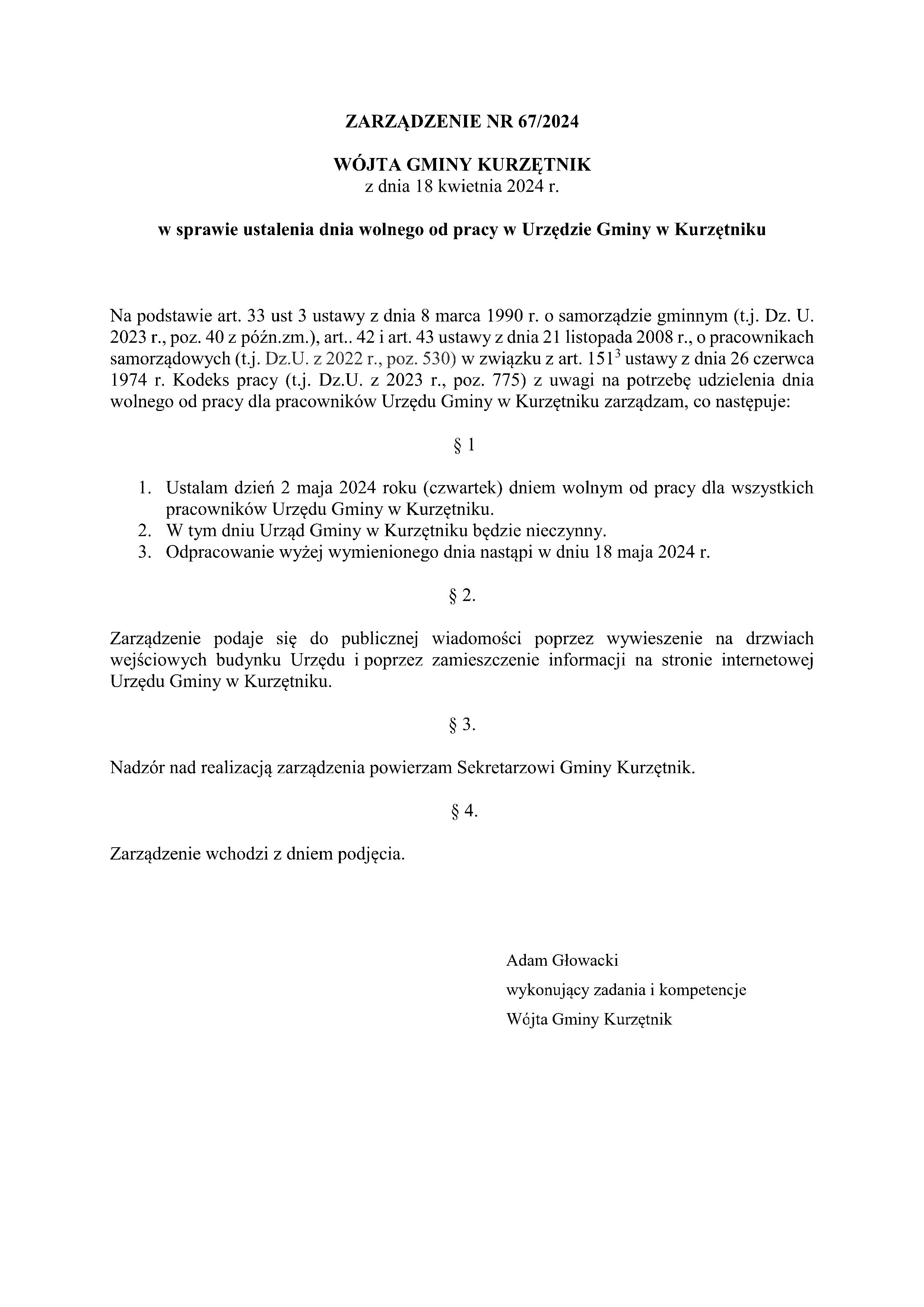 ZARZĄDZENIE NR 67/2024 WÓJTA GMINY KURZĘTNIK z dnia 18 kwietnia 2024 r. w sprawie ustalenia dnia wolnego od pracy w Urzędzie Gminy w Kurzętniku