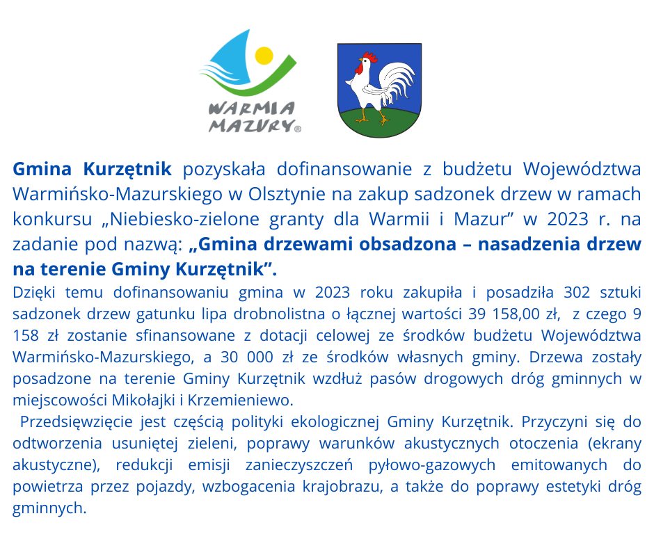 Gmina Kurzętnik pozyskała dofinansowanie z budżetu Województwa Warmińsko-Mazurskiego w Olsztynie na zakup sadzonek drzew w ramach konkursu „Niebiesko-zielone granty dla Warmii i Mazur” w 2023 r.