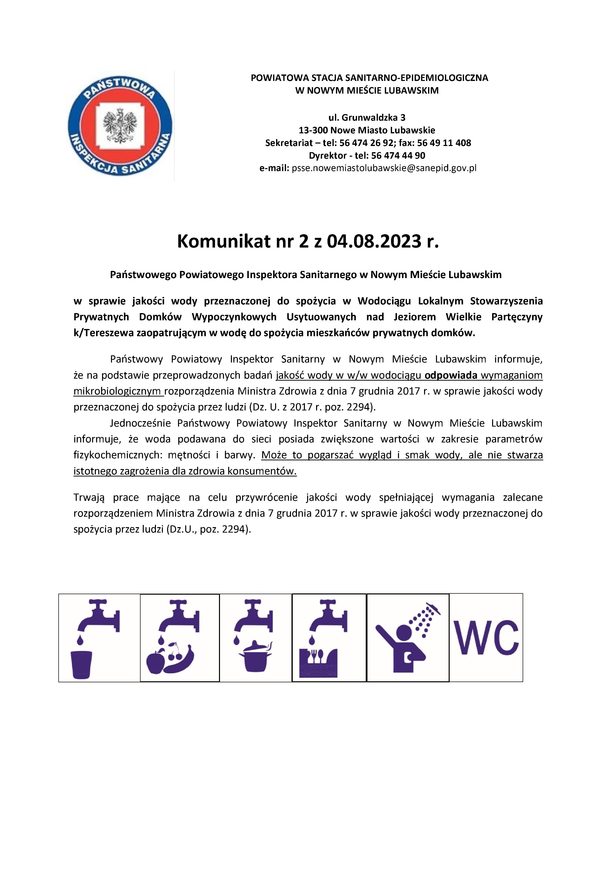 Komunikat z Państwowego Powiatowego Inspektora Sanitarnego w Nowym Mieście Lubawskim w sprawie jakości wody pitnej.