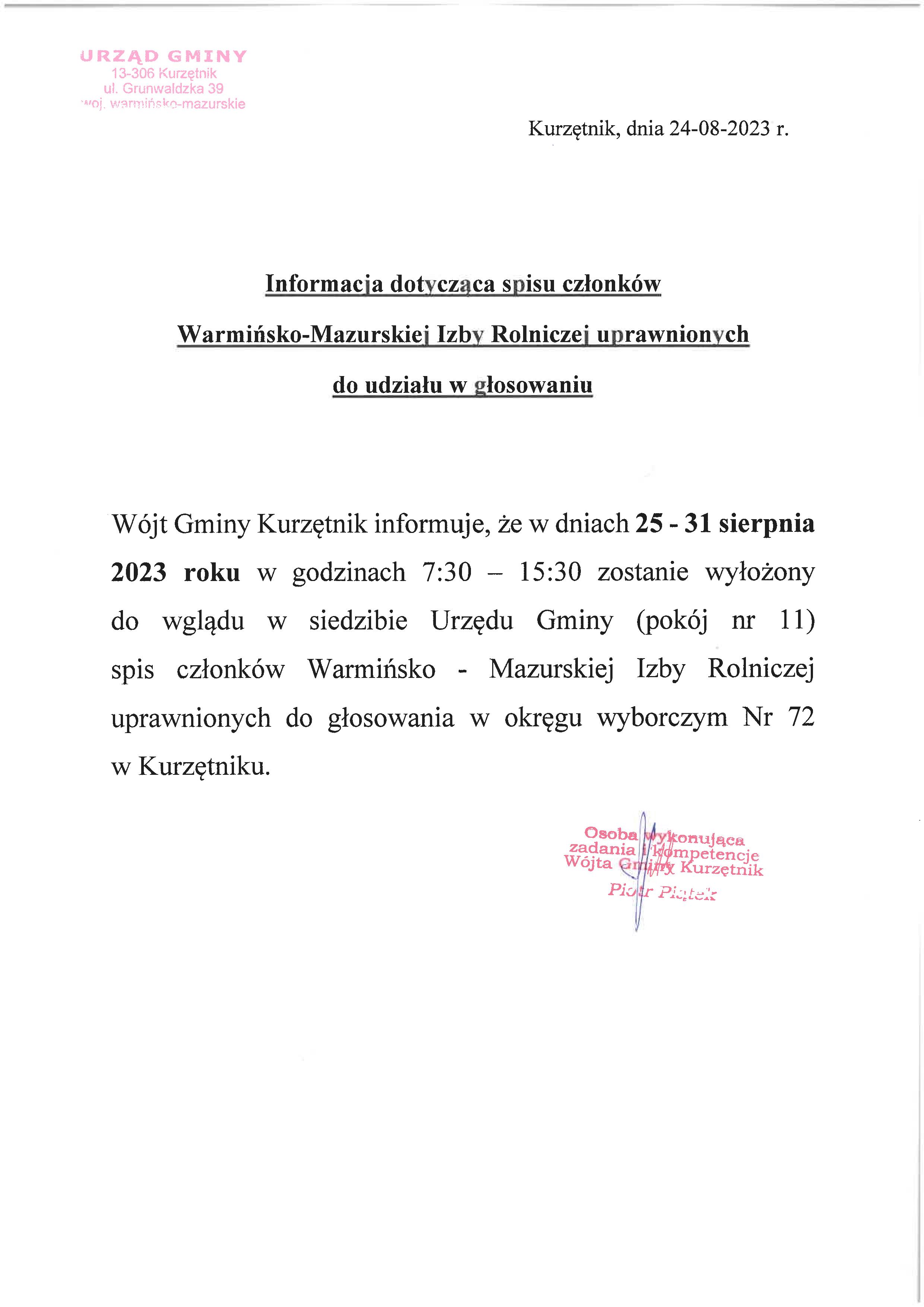 Informacja dotycząca spisu członków Warmińsko-Mazurskiej Izby Rolniczej uprawnionych do udziału w głosowaniu