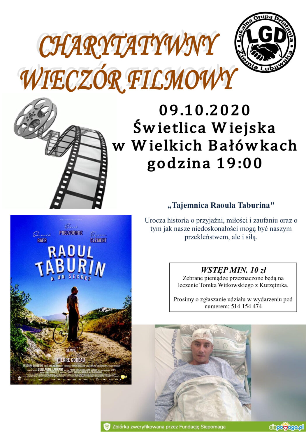 Informujemy, iż 9 października (piątek) o godzinie 19:00 odbędzie się Charytatywny Wieczór Filmowy w Świetlicy Wiejskiej w Wielkich Bałówkach!