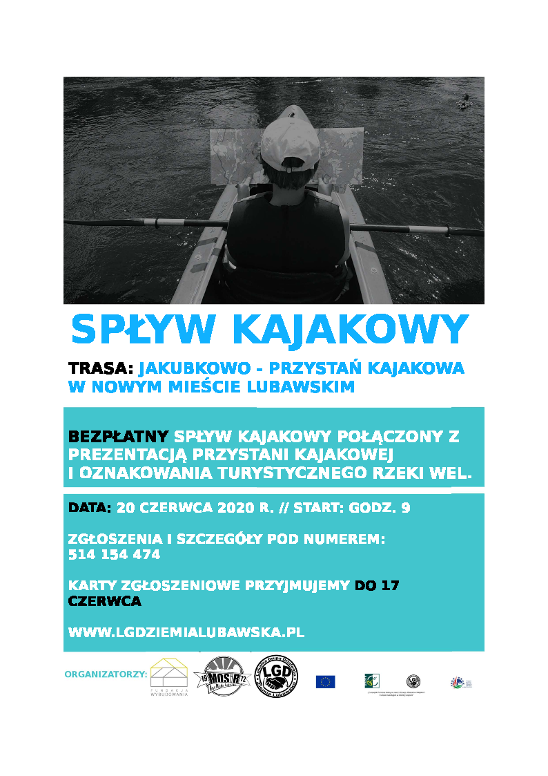 Spływ kajakowy wraz z Fundacją Wybudowania oraz Miejskim Ośrodkiem Sportu i Rekreacji, który odbędzie się 20 czerwca 2020 r. Zbiórka będzie miała miejsce na Przystani kajakowej w Nowym Mieście Lubawskim. Spływ kajakowy połączony będzie z otwarciem sezonu na przystani kajakowej w Nowym Mieście Lubawskim oraz prezentacją oznakowania turystycznego rzeki Wel. Zgłoszenia przyjmowane są do 17 czerwca 2020 r. na adres jcabaj@lgdziemialubawska.pl