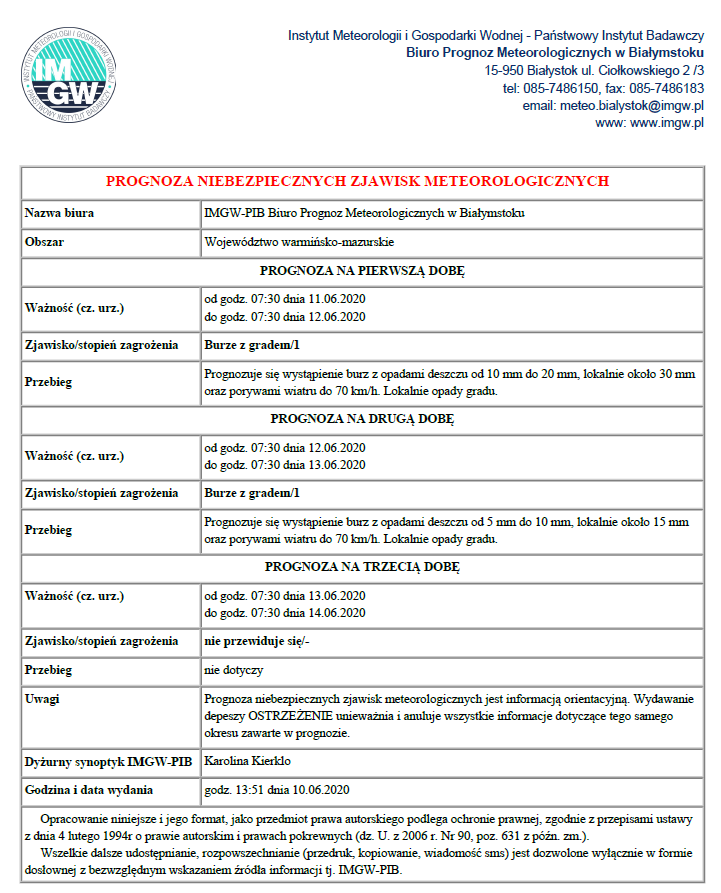 Ostrzeżenie burze z gradem 09-12.06.2020 r.