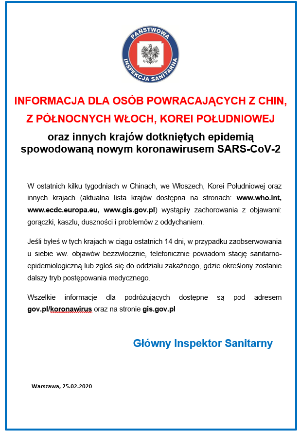 Informacja Państwowego Powiatowego Inspektora Sanitarnego w Nowym Mieście Lubawskim dla osób powracających z Chin, Północnych Włoch, Korei i innych krajów
