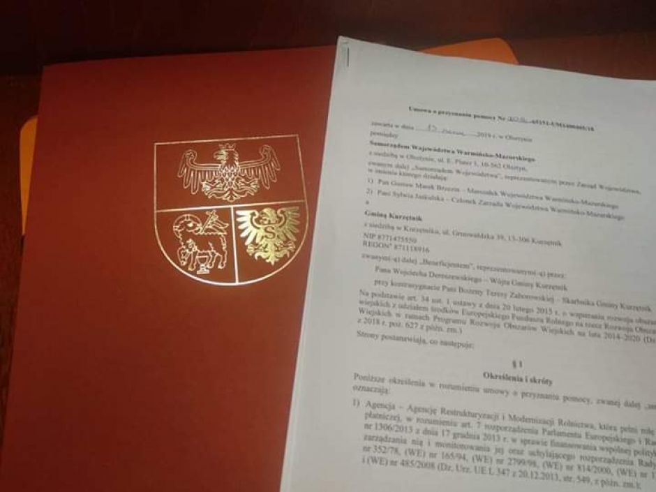 W środę, 13 marca, w siedzibie Urzędu Marszałkowskiego w Olsztynie Gmina Kurzętnik reprezentowana przez wójta gminy pana Wojciecha Dereszewskiego oraz skarbnik gminy panią Bożenę Zaborowską zawarła umowę o przyznaniu pomocy na realizację zadania „Przebudowa ulicy Szkolnej, Okólnej i Okrężnej oraz drogi stanowiącej działkę nr 9/47 wraz z budową skrzyżowania drogi wojewódzkiej Nr 538 (dz. nr 90) z droga gminną (dz. nr 9/47) w Marzęcicach”.