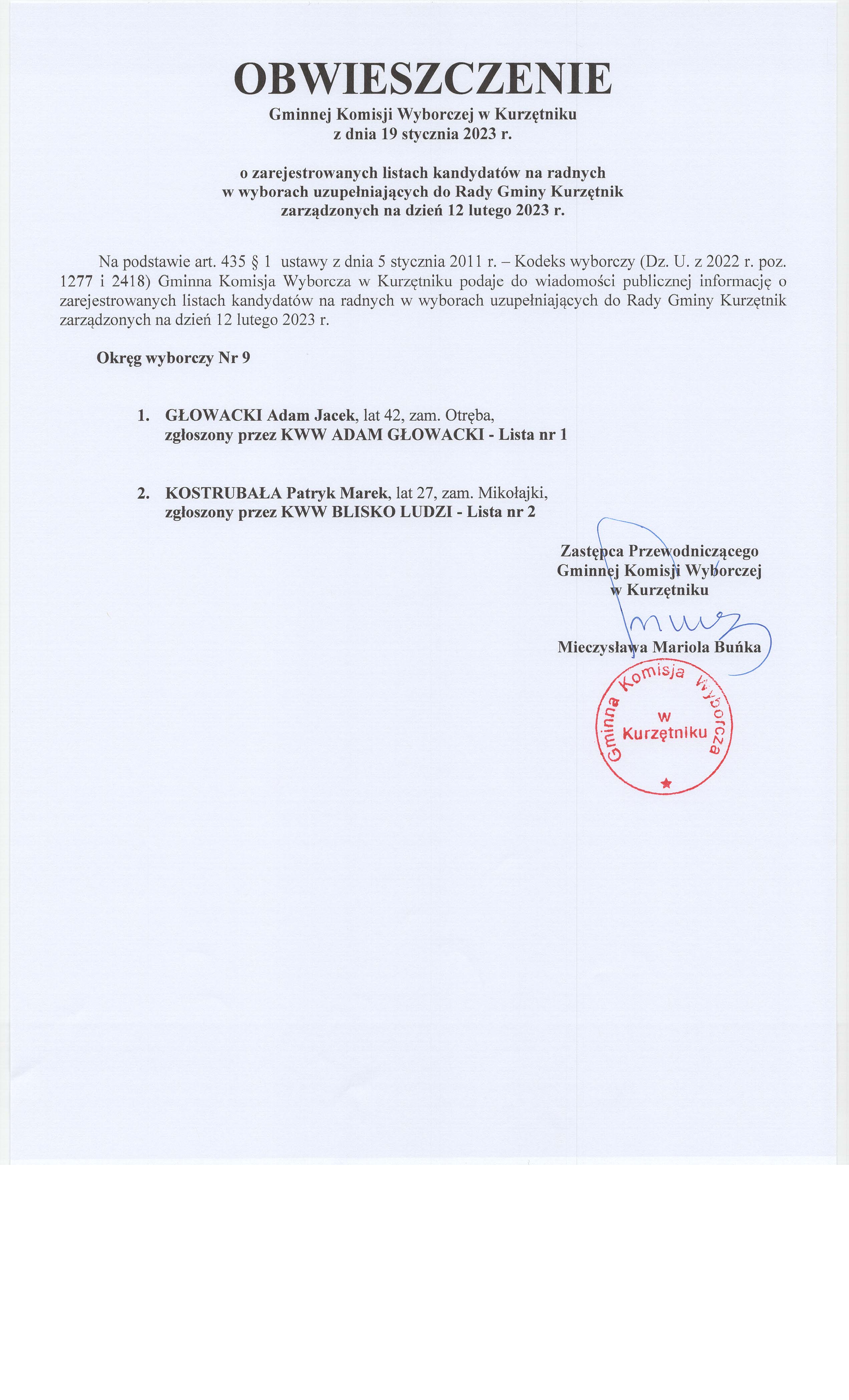 wybory uzupełniające do Rady Gminy okręg nr 9